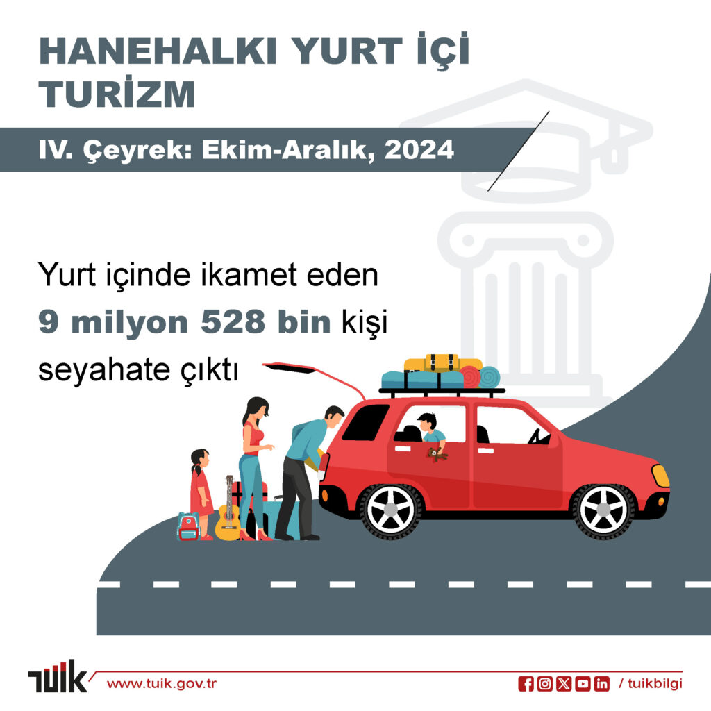 TÜİK verilerine göre, 2024 yılının Ekim-Aralık döneminde yurt içinde ikamet eden 9 milyon 528 bin kişi seyahate çıktı. Bu çeyrekte yapılan toplam seyahat sayısı 11 milyon 467 bin olarak kaydedilirken, ortalama geceleme süresi 6,7 gece oldu. Yıllık bazda ise toplam seyahat sayısı %8,7 artışla 66 milyon 836 bine ulaştı.