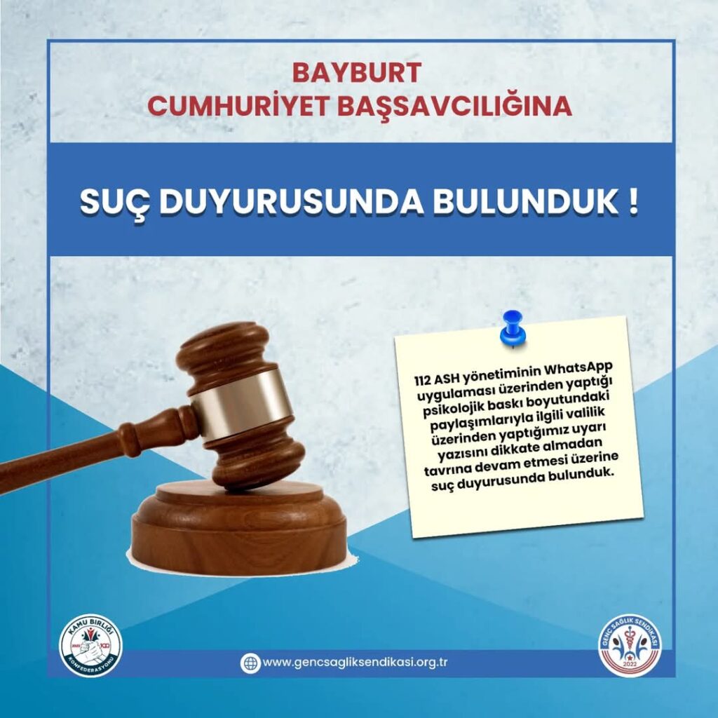 “112 ASH yönetiminin WhatsApp uygulaması üzerinden yaptığı psikolojik baskı boyutundaki paylaşımlarına karşı yetkililer aracılığıyla yaptığımız uyarılar dikkate alınmamıştır. Bu nedenle Bayburt Cumhuriyet Başsavcılığı’na suç duyurusunda bulunduk. Bu süreçte sessiz kalmayacağız, çalışanlarımızı yalnız bırakmayacağız.”