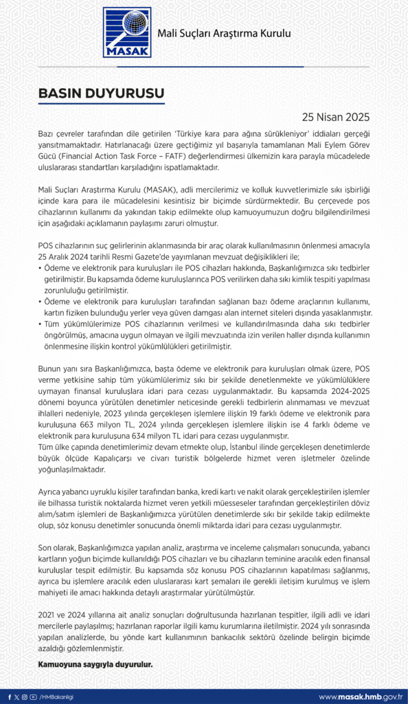 MASAK, kara para ile mücadelesinin kesintisiz sürdüğünü, adli merciler ve kolluk kuvvetleriyle işbirliği içinde çalışmalarını kararlılıkla yürüttüğünü açıkladı. Ayrıca, POS cihazları ve ödeme sistemleriyle ilgili yapılan yeni düzenlemelerin önemine de dikkat çekti.