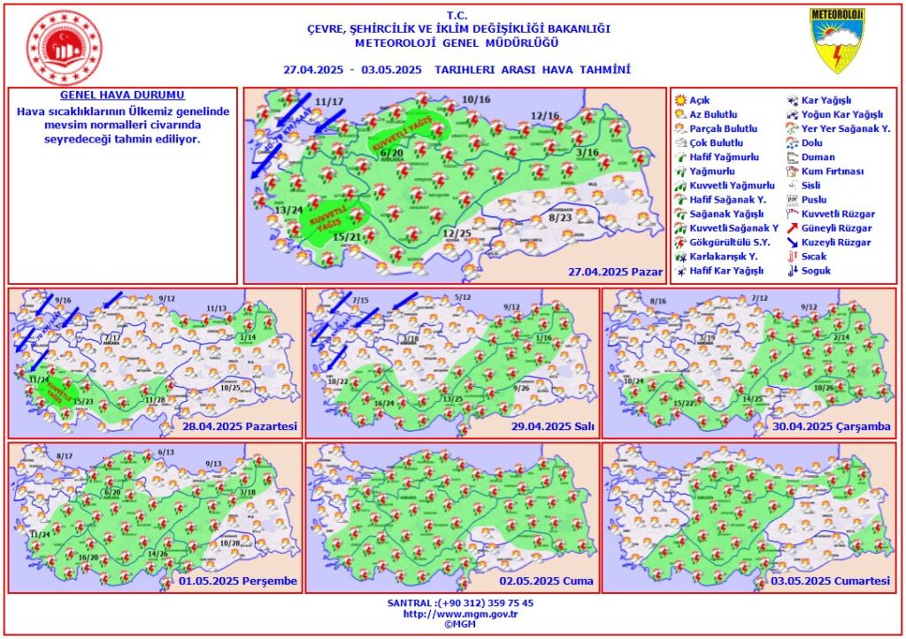 Meteoroloji Genel Müdürlüğü (MGM) tarafından yayımlanan son hava tahminlerine göre, 27 Nisan – 3 Mayıs 2025 tarihleri arasında hava sıcaklıklarının ülkemiz genelinde mevsim normalleri civarında seyretmesi bekleniyor.