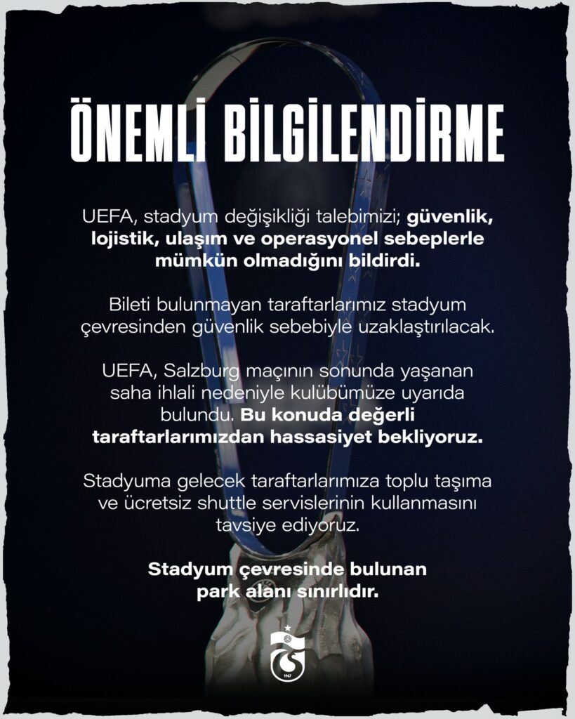 Trabzonspor, UEFA’nın stadyum değişikliği talebini güvenlik, lojistik, ulaşım ve operasyonel sebeplerle reddettiğini duyurdu. Kulüpten yapılan açıklamada, bileti olmayan taraftarların stadyum çevresinden güvenlik nedeniyle uzaklaştırılacağı vurgulandı.