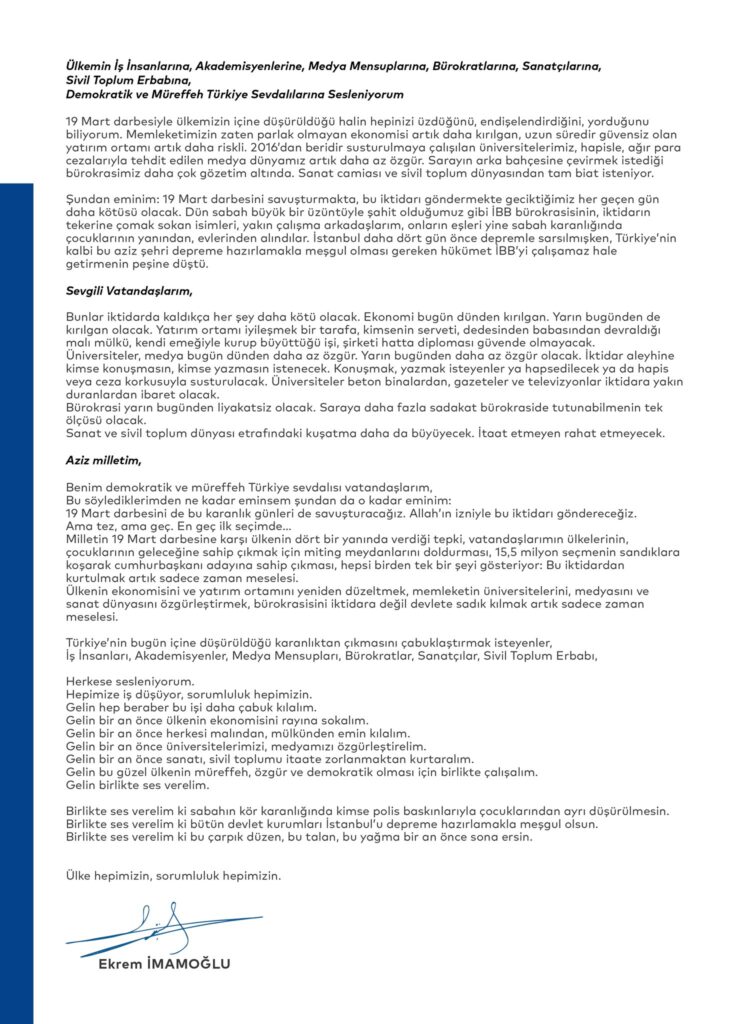 Tutuklu Cumhurbaşkanı Adayı Ekrem İmamoğlu’ndan Ülkemin İş İnsanlarına, Akademisyenlerine, Medya Mensuplarına, Bürokrasi Çalışanlarına, Sanatçılarına, Sivil Toplum Erbabına ve Demokratik Türkiye Sevdalılarına Çağrı!