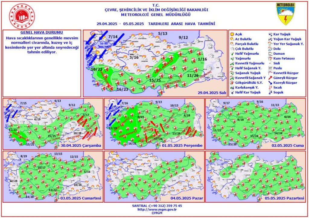 Meteoroloji Genel Müdürlüğü (MGM) tarafından açıklanan haftalık hava tahminine göre, 29 Nisan – 5 Mayıs 2025 tarihleri arasında ülke genelinde hava sıcaklıklarının mevsim normalleri civarında seyretmesi bekleniyor. Ancak, kuzey ve iç kesimlerde yer yer mevsim normallerinin altında soğuk hava etkili olabilir.
