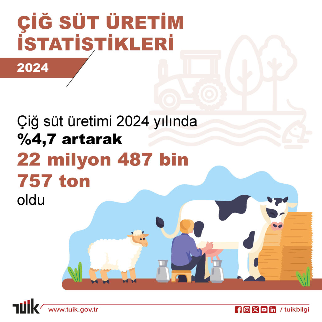 Türkiye İstatistik Kurumu (TÜİK), 2024 yılına ait Çiğ Süt Üretim İstatistiklerini yayımladı. TÜİK’in 2 Mayıs 2025 tarihinde saat 10.00’da duyurduğu verilere göre, 2024 yılında çiğ süt üretimi bir önceki yıla göre %4,7 artış göstererek 22 milyon 487 bin 757 ton seviyesine ulaştı.