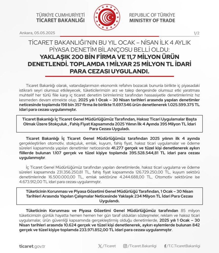 Ticaret Bakanlığı, 2025 yılının Ocak-Nisan dönemine ilişkin piyasa denetim bilançosunu açıkladı. Tüketici haklarının korunması ve piyasa istikrarının sağlanması amacıyla yürütülen denetimlerde yaklaşık 200 bin firma ve 11,7 milyon ürün incelendi. Denetimler sonucunda toplam 1 milyar 25 milyon TL idari para cezası uygulandı.