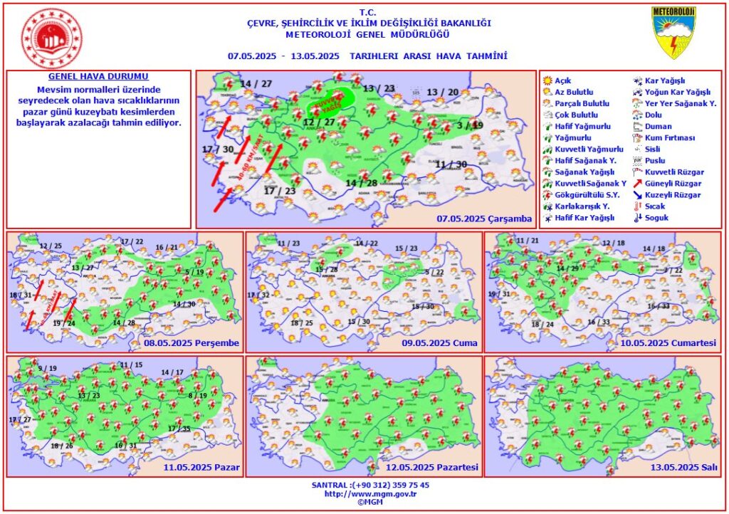 Meteoroloji Genel Müdürlüğü, 7 – 13 Mayıs 2025 tarihleri arasını kapsayan haftalık hava durumu raporunu yayımladı. Rapora göre; hava sıcaklıkları mevsim normallerinin üzerinde seyretmeye devam ederken, hafta sonuna doğru ülke genelinde yeni bir yağışlı sistemin etkili olması bekleniyor.