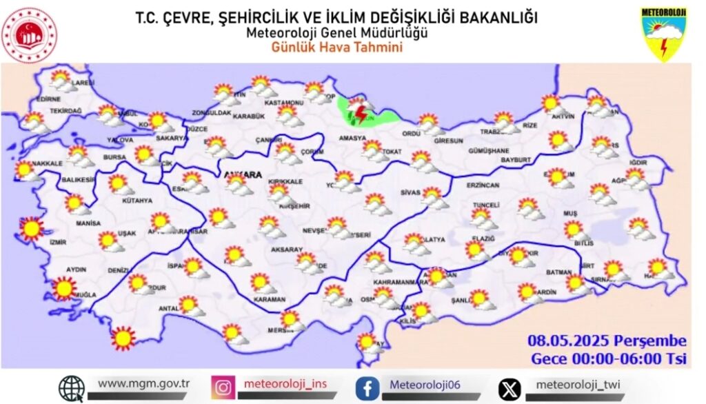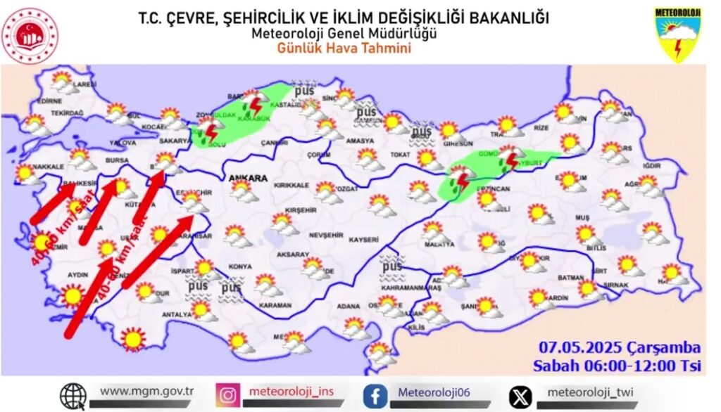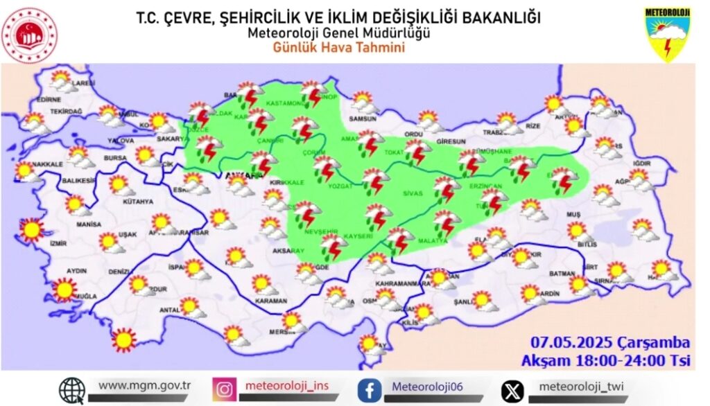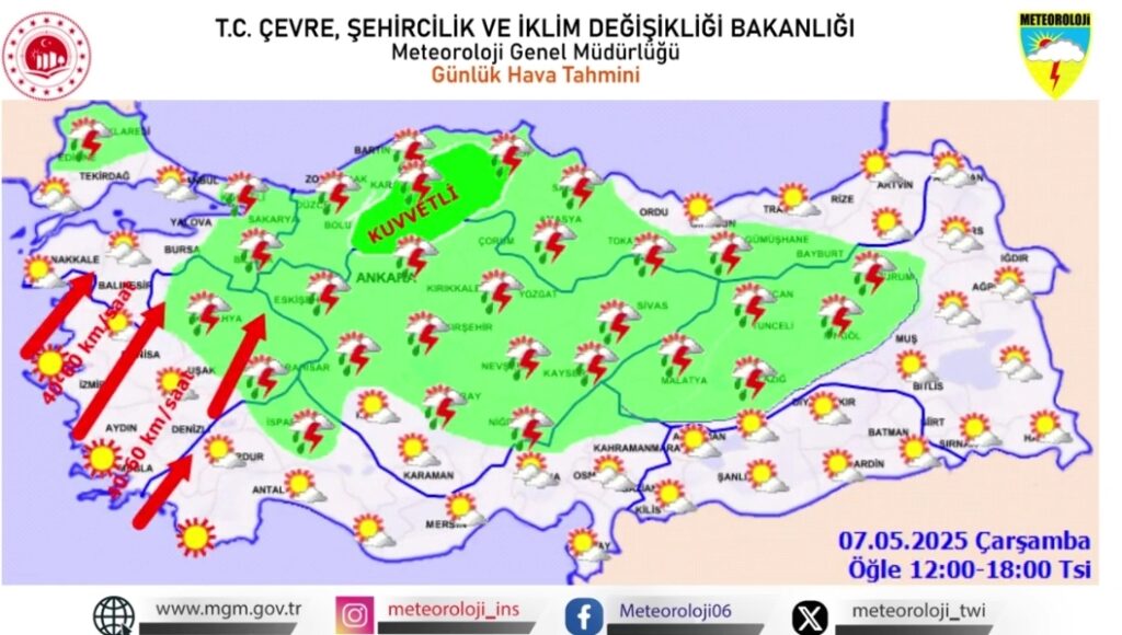 Meteoroloji Genel Müdürlüğü, 7 Mayıs 2025 Çarşamba günü için Türkiye genelinde etkili olacak kuvvetli yağış ve rüzgâr uyarısında bulundu. Vatandaşların sel, su baskını, yıldırım, ulaşımda aksamalar ve çatı uçması gibi olumsuzluklara karşı dikkatli ve tedbirli olması istendi.