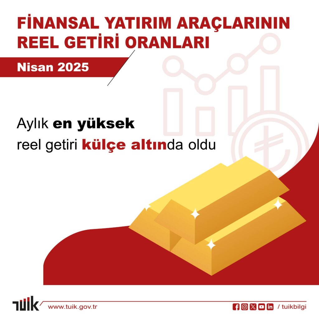 Türkiye İstatistik Kurumu (TÜİK), “Finansal Yatırım Araçlarının Reel Getiri Oranları, Nisan 2025” bültenini yayımladı. Verilere göre, Nisan ayında yatırımcısına en yüksek reel getiriyi külçe altın sağladı.