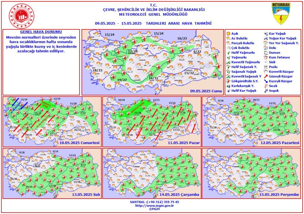 Meteoroloji Genel Müdürlüğü, 9 – 15 Mayıs 2025 tarihlerini kapsayan haftalık hava durumu tahmin raporunu yayımladı. Türkiye genelinde mevsim normallerinin üzerinde seyreden hava sıcaklıklarının, özellikle hafta sonu itibarıyla yağışlı sistemin etkisiyle kuzey ve iç kesimlerde azalacağı öngörülüyor.