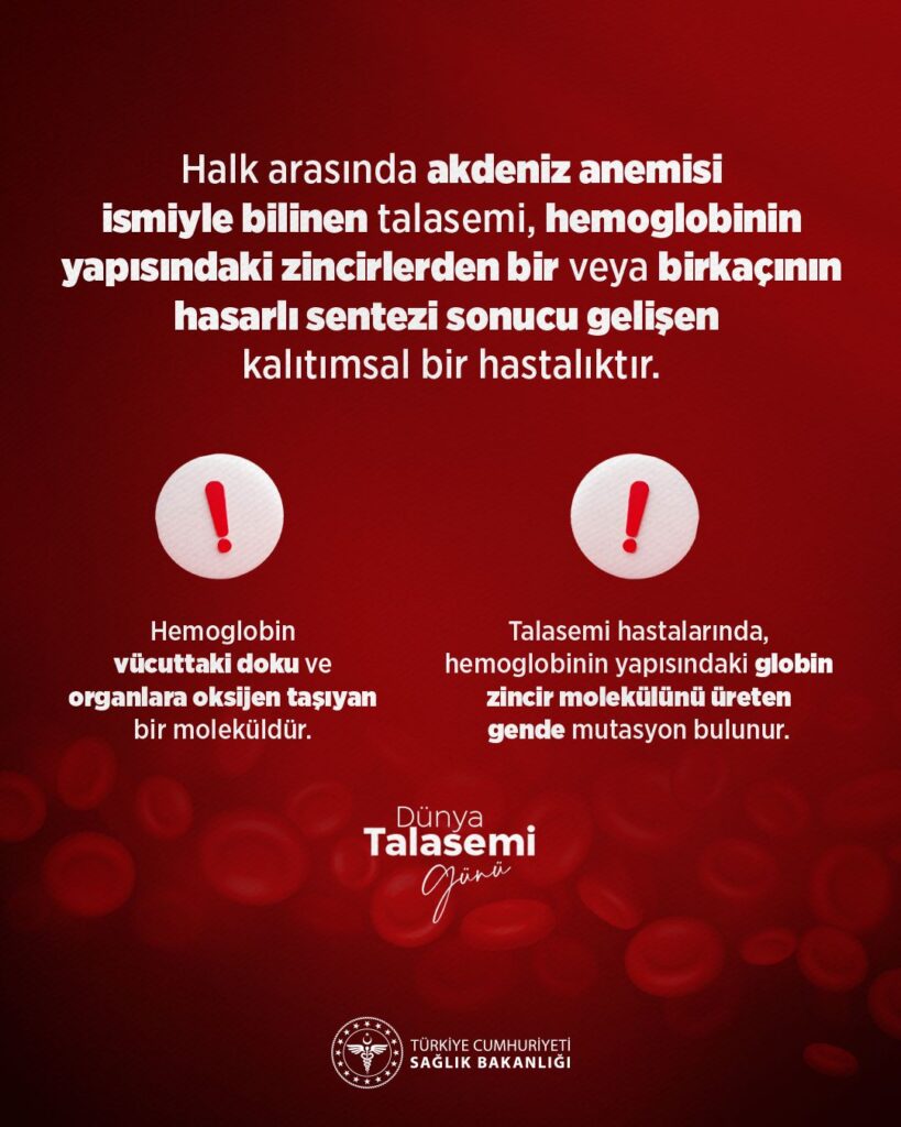 Türkiye Cumhuriyeti Sağlık Bakanlığı, 8 Mayıs Dünya Talasemi Günü kapsamında halk arasında Akdeniz anemisi olarak bilinen talasemi hastalığına dikkat çekti. Bakanlık tarafından yapılan bilgilendirmede, talaseminin kalıtımsal bir kan hastalığı olduğu vurgulandı.