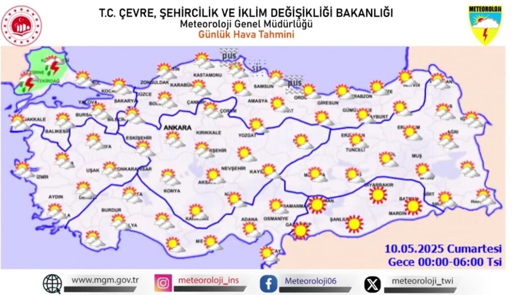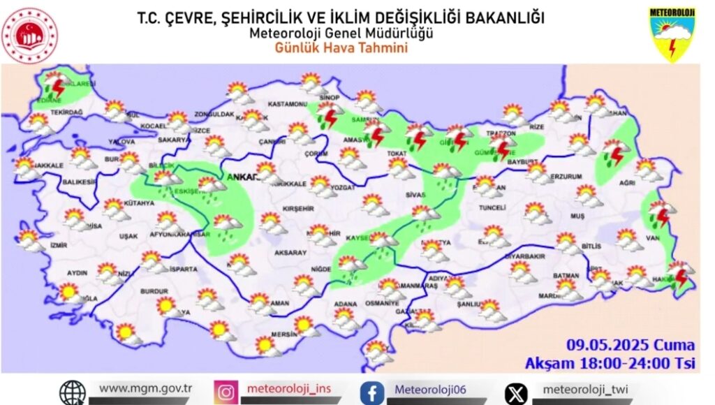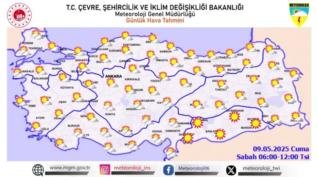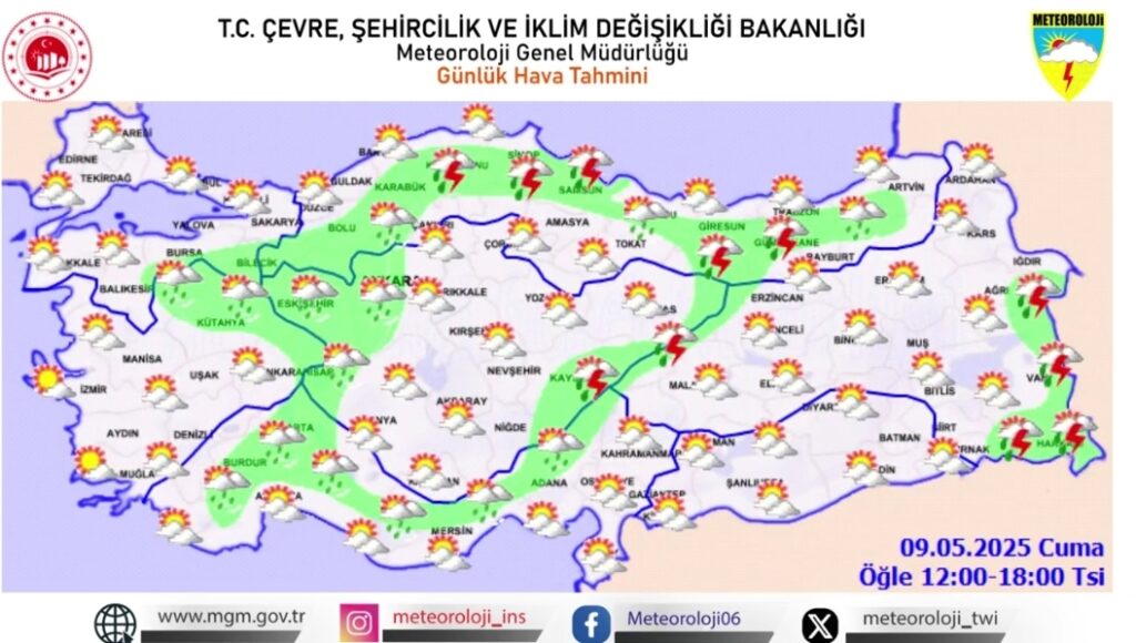 Meteoroloji Genel Müdürlüğü, 9 Mayıs 2025 Cuma ve 10 Mayıs 2025 Cumartesi günleri için Türkiye geneli hava durumu tahminlerini açıkladı. Haritalara göre ülke genelinde dikkat edilmesi gereken hava olayları bulunuyor.