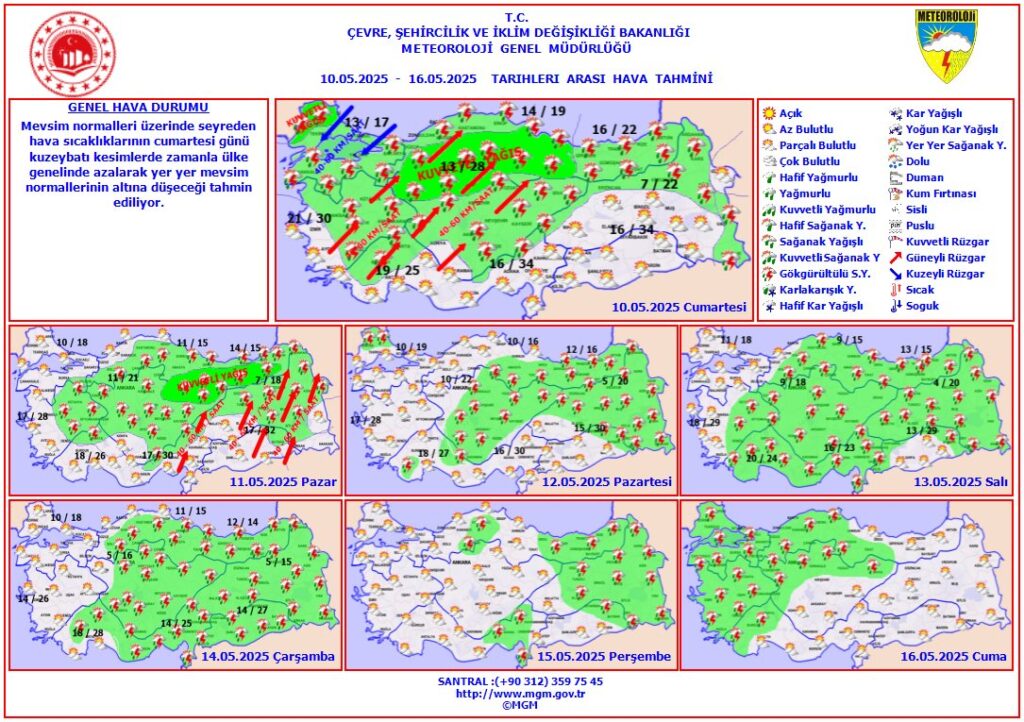 Meteoroloji Genel Müdürlüğü (MGM), 10-16 Mayıs 2025 tarihlerini kapsayan haftalık hava durumu tahmin raporunu yayımladı. Buna göre, sıcaklıkların kuzeybatıdan başlayarak ülke genelinde azalması ve yer yer mevsim normallerinin altına düşmesi bekleniyor. Ayrıca hafta boyunca kuvvetli rüzgarlar, yerel fırtınalar ve sağanak yağışlar birçok bölgede etkili olacak.