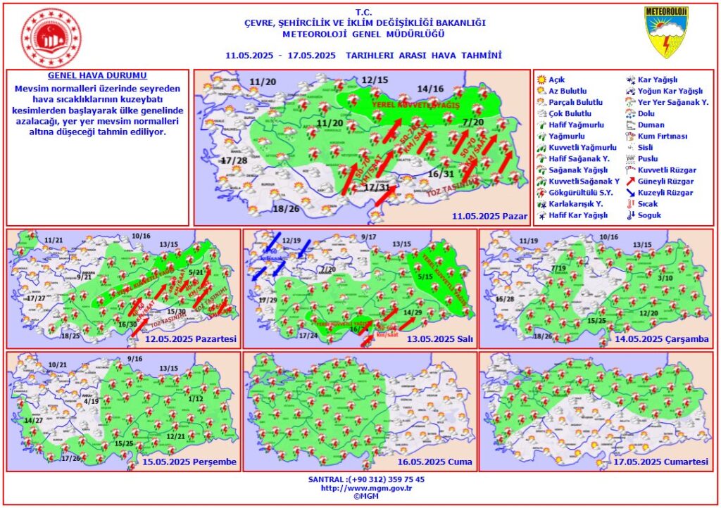 Meteoroloji Genel Müdürlüğü’nün 11-17 Mayıs 2025 haftasına ilişkin tahminlerine göre, haftaya sağanak yağışlarla başlanacak, hafta ortasından itibaren hava açacak. Kuzeybatıdan başlayarak hava sıcaklıkları ülke genelinde düşecek, ancak hafta sonuna doğru tekrar yükselişe geçmesi bekleniyor. Özellikle Karadeniz ve doğu bölgelerinde yerel kuvvetli yağışlara karşı dikkatli olunmalı.