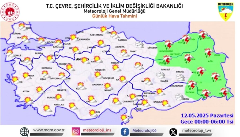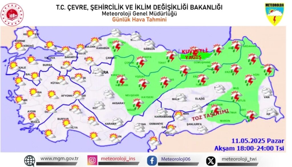 Meteoroloji Genel Müdürlüğü, 11 Mayıs Pazar günü için Türkiye genelinde etkili olması beklenen hava olaylarına karşı vatandaşları uyardı. Özellikle Orta ve Doğu Karadeniz, İç Anadolu’nun doğusu, Doğu Anadolu’nun kuzeyi ve Güneydoğu Anadolu bölgelerinde dikkatli olunması gerektiği vurgulandı.