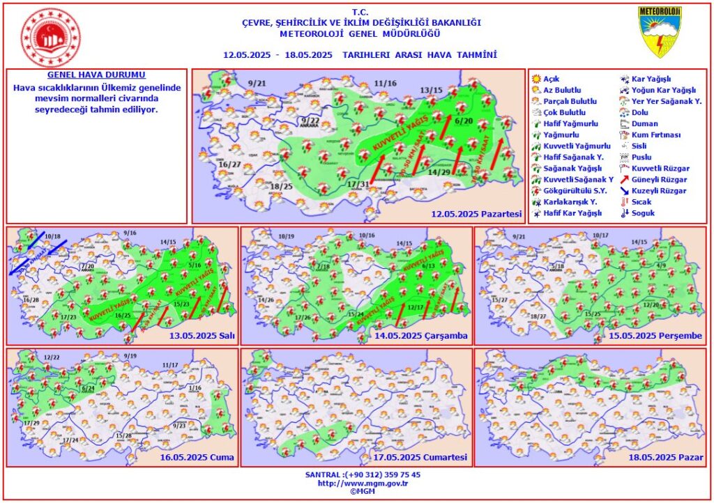 Meteoroloji Genel Müdürlüğü’nün 12 – 18 Mayıs 2025 tarihli haftalık hava tahmin raporuna göre, Türkiye genelinde hava sıcaklıkları mevsim normalleri civarında seyredecek. Özellikle Karadeniz Bölgesi’nde hafta boyunca aralıklarla sağanak yağışlar etkili olurken, batı ve güney bölgelerde parçalı bulutlu ve güneşli günler öne çıkıyor.