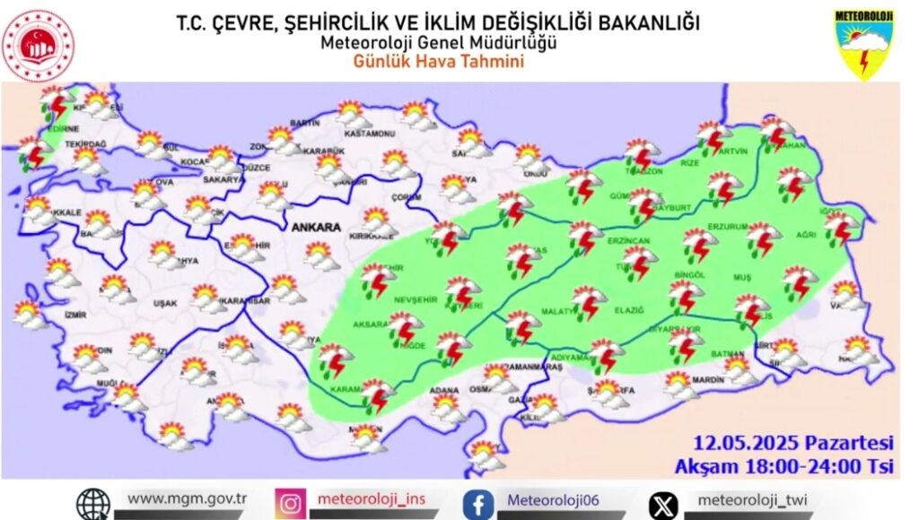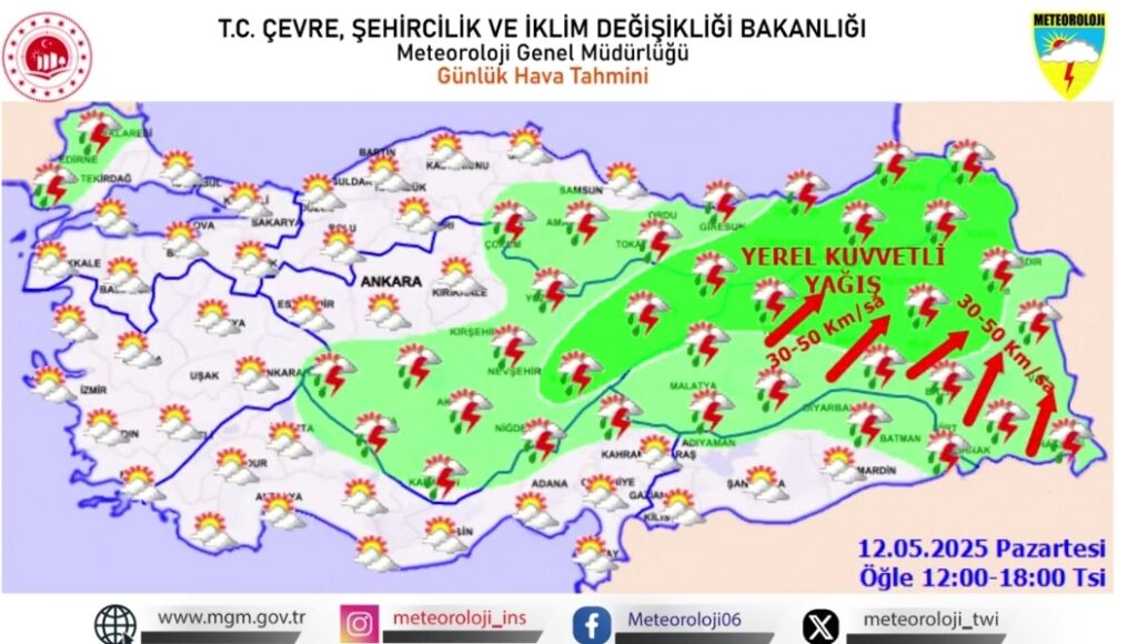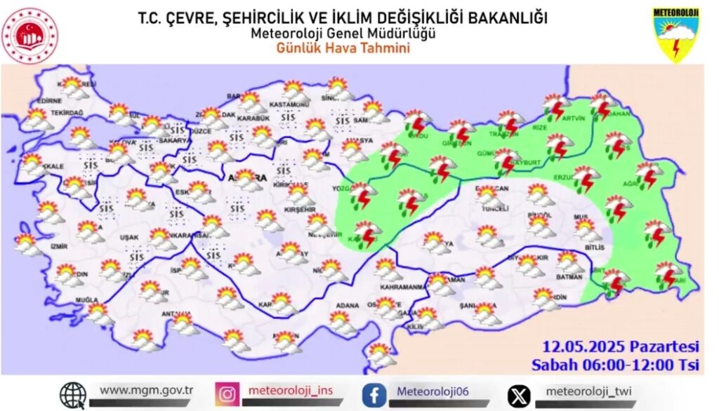 Meteoroloji Genel Müdürlüğü, 12 Mayıs 2025 Pazartesi günü için yurt genelinde hava durumu uyarısı yayımladı. Vatandaşların kuvvetli yağış, rüzgâr ve sis olaylarına karşı dikkatli ve tedbirli olmaları istendi.