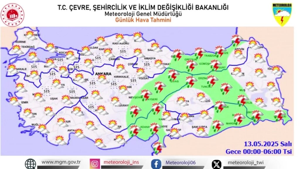 Meteoroloji, 12 Mayıs 2025 Pazartesi günü için kuvvetli yağış, sert rüzgâr ve sis uyarılarında bulundu. Doğu Karadeniz, Doğu Anadolu’nun kuzeyi ve Güneydoğu Anadolu’nun doğusunda yerel olarak şiddetli sağanaklar bekleniyor, bu bölgelerde yıldırım ve gök gürültüsü de görülmesi muhtemel. Doğu Anadolu’da rüzgârın 30-50 km/saat hızla esmesi beklenirken, sabah saatlerinde Marmara ve Batı Karadeniz’de sis oluşumu görüş mesafesini düşürebilir. 13 Mayıs Salı sabahı, Doğu Anadolu’nun yüksek kesimlerinde karla karışık yağmur veya kar yağışı bekleniyor. Vatandaşların, sel, su baskını ve ulaşım aksamaları gibi olumsuzluklara karşı dikkatli ve tedbirli olmaları önem arz ediyor.