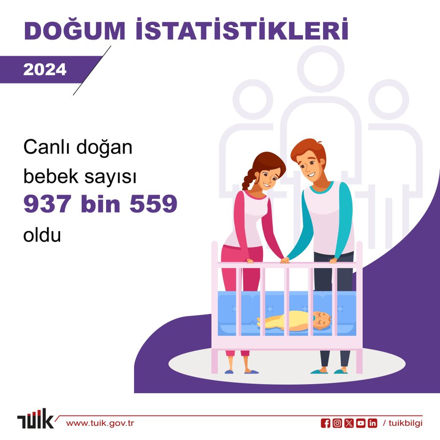 Türkiye İstatistik Kurumu (TÜİK), 2024 yılına ait doğum istatistiklerini açıkladı. Verilere göre, 2024 yılında canlı doğan bebek sayısı 937 bin 559 oldu. Bu bebeklerin %51,4’ü erkek, %48,6’sı ise kız.