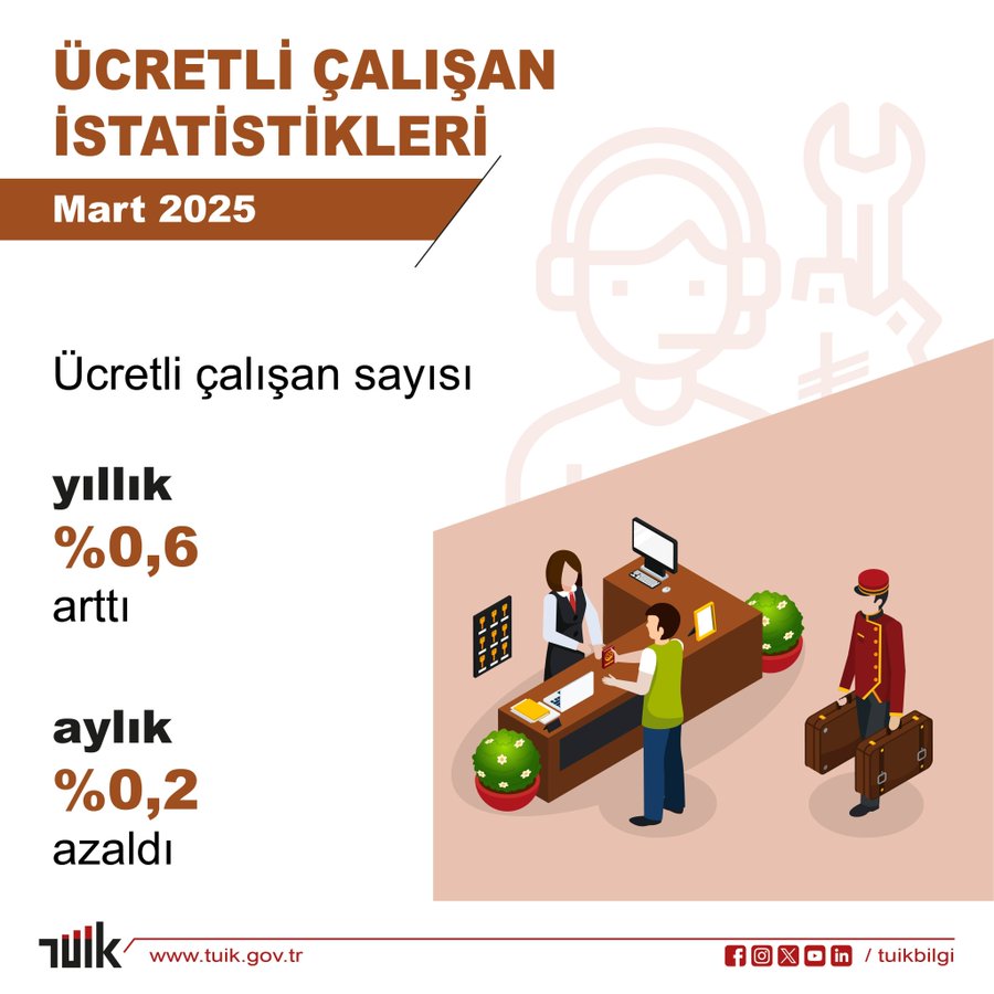 2025 yılı Mart ayında bir önceki aya kıyasla toplam ücretli çalışan sayısı %0,2 azaldı.