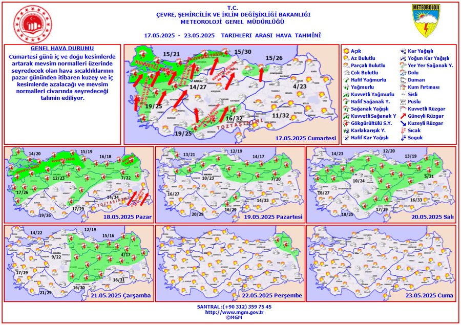 Meteoroloji Genel Müdürlüğü’nün (MGM) 17 – 23 Mayıs 2025 tarihli hava tahmin raporuna göre, hafta sonu yurt genelinde yağışlı ve serin hava etkili olurken, hafta ortasından itibaren yağışlar azalacak, sıcaklıklar mevsim normallerine dönecek. Güney ve güneydoğu bölgelerinde ise sıcaklıklar hafta boyunca 30°C’yi aşabilir.