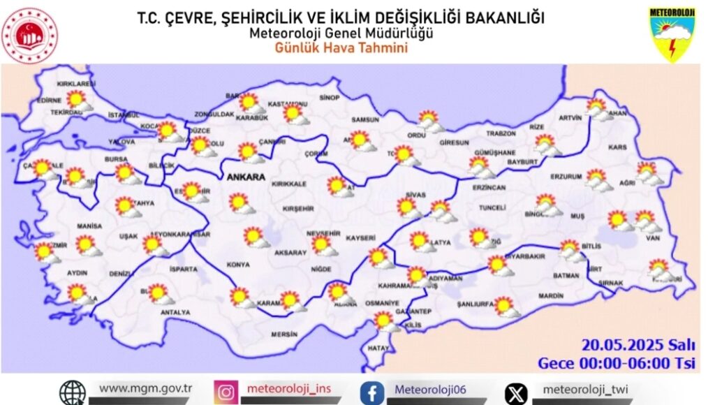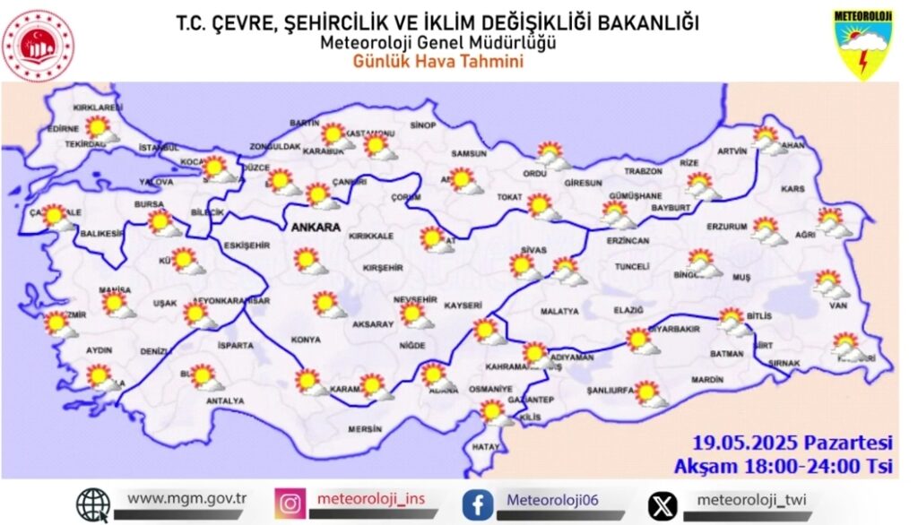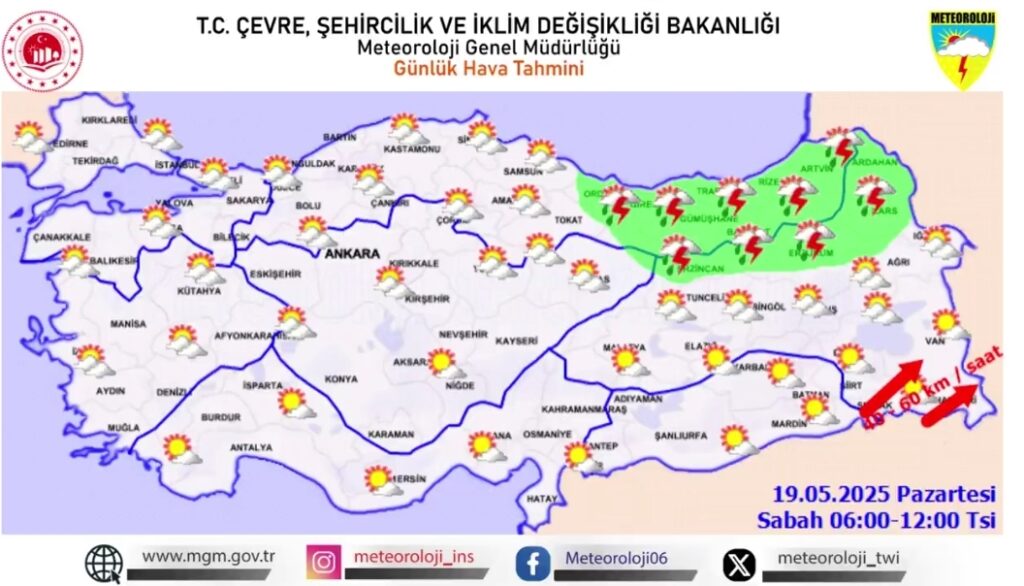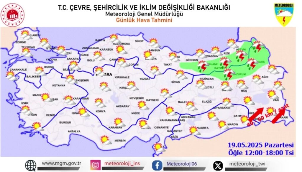 19 Mayıs 2025 Pazartesi günü için Meteoroloji Genel Müdürlüğü, Doğu Karadeniz ile Doğu Anadolu’nun kuzeydoğusunda gök gürültülü sağanak yağış, Doğu Anadolu’nun güneydoğusunda ise toz taşınımı ve kuvvetli rüzgar uyarısında bulundu. Rize, Artvin, Kars ve Ardahan çevrelerinde yağışların yer yer kuvvetli olması beklenirken, Hakkari ve çevresinde rüzgarın saatte 60 km’ye ulaşabileceği bildirildi. Toz taşınımı nedeniyle görüş mesafesi azalabilir, hava kalitesi düşebilir. Salı sabahından itibaren ise ülke genelinde hava açık ve yağışsız olacak.
