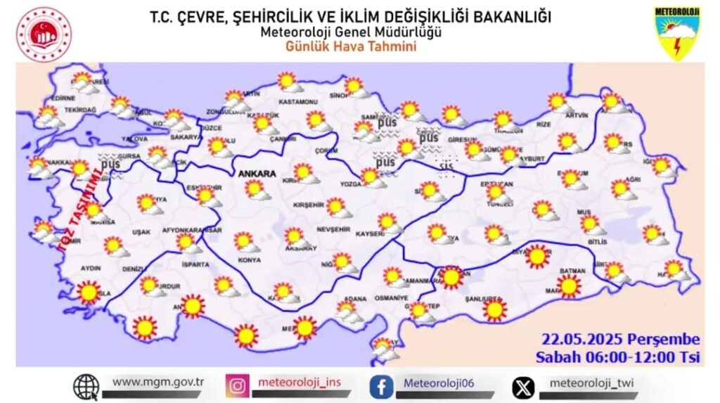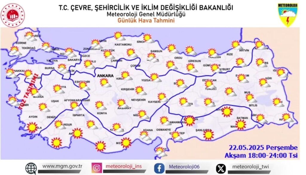 22 Mayıs 2025 Perşembe günü Türkiye genelinde hava sıcaklıklarının artarak mevsim normallerinin üzerine çıkması bekleniyor. Sabah saatlerinde kuzey ve batı bölgelerde parçalı bulutlu bir hava hâkimken, öğle saatlerinden itibaren özellikle iç ve kuzey kesimlerde yerel sağanak yağış geçişleri görülebilecek. Ege ve Akdeniz kıyılarında ise güneşli ve sıcak hava etkisini sürdürecek. Akşam saatlerinde yağışlar azalacak, gece saatlerinde ise ülke genelinde az bulutlu ve sakin bir hava öngörülüyor. Meteoroloji, sıcaklık artışına karşı vatandaşları tedbirli olmaya çağırdı.
