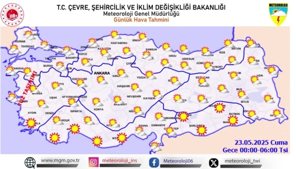 22 Mayıs Perşembe günü Türkiye’nin iç ve kuzey kesimlerinde öğle saatlerinde yerel sağanaklar görülebilirken, diğer bölgelerde güneşli ve sıcak bir hava etkili olacak. Akşam saatlerinden itibaren yağışlar sona erecek. 23 Mayıs Cuma gecesi ise ülke genelinde sakin ve açık bir hava bekleniyor.