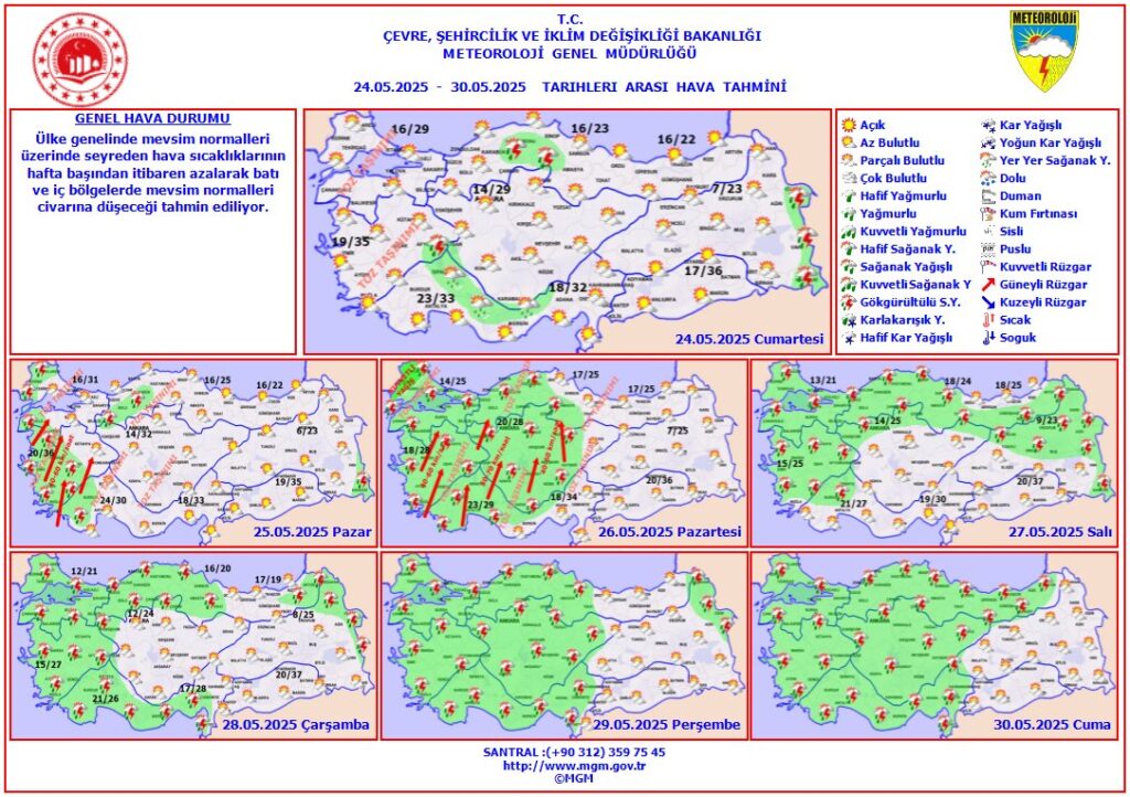 Meteoroloji Genel Müdürlüğü’nün 24-30 Mayıs 2025 haftasına ilişkin tahminlerine göre, Türkiye genelinde mevsim normalleri üzerinde seyreden hava sıcaklıkları hafta başından itibaren düşüşe geçecek. Özellikle batı ve iç bölgelerde sıcaklıklar mevsim normallerine yaklaşırken, yurdun büyük bölümünde sağanak yağışlar etkili olacak. Hafta ortasından itibaren yağışların doğuya kaymasıyla birlikte batıda hava açacak ve sıcaklıklar yeniden artışa geçerek haftanın sonuna doğru 30°C’nin üzerine çıkabilecek. Vatandaşların ani hava değişimlerine karşı tedbirli olmaları isteniyor.