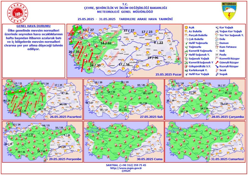 Meteoroloji Genel Müdürlüğü, 25 – 31 Mayıs 2025 tarihlerini kapsayan haftalık hava tahmini raporunu yayımladı. Türkiye genelinde mevsim normallerinin üzerinde seyreden sıcaklıkların hafta başından itibaren özellikle batı ve iç bölgelerde düşeceği, hafta ortasından itibaren ise yaygın sağanak yağışların etkili olacağı bildirildi. Hafta sonunda ise yağışların doğuya çekilmesi ve sıcaklıkların yeniden yükselmesi bekleniyor.