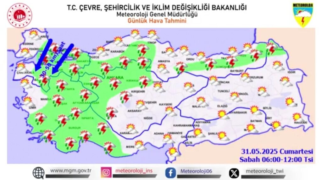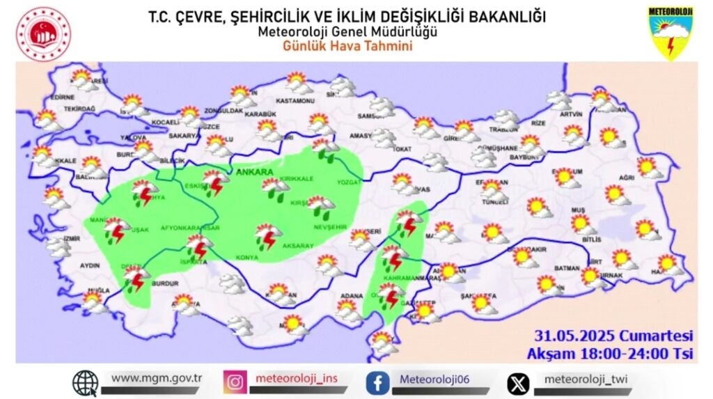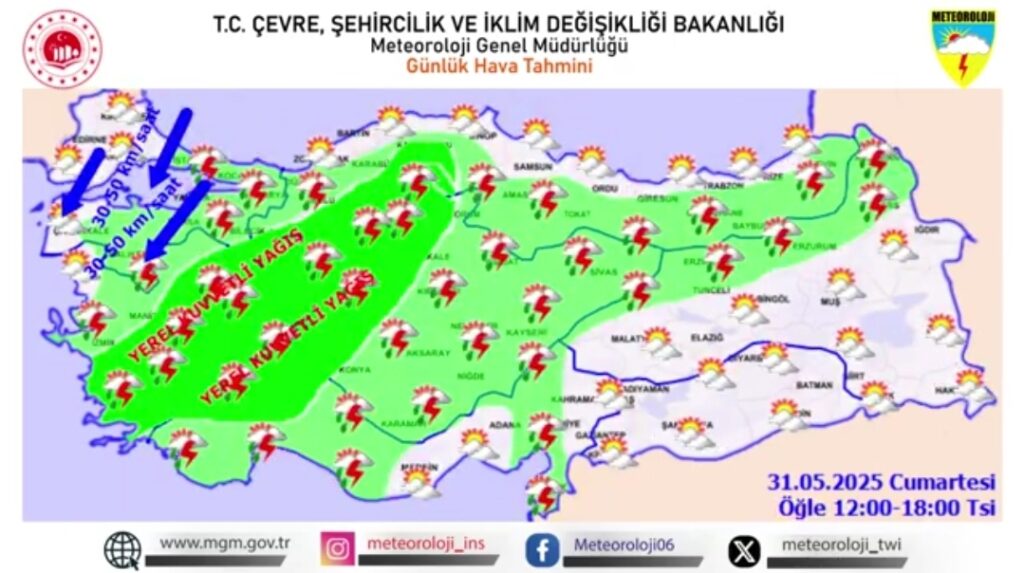 🗓️ 31 Mayıs 2025 Cumartesi günü Türkiye genelinde yer yer kuvvetli sağanak yağışlar ve etkili rüzgarlar bekleniyor. Meteoroloji kaynaklarına göre özellikle İç Anadolu, Ege’nin iç kesimleri, Batı Akdeniz ve Batı Karadeniz’in iç kesimlerinde şiddetli hava olayları görülebilir.