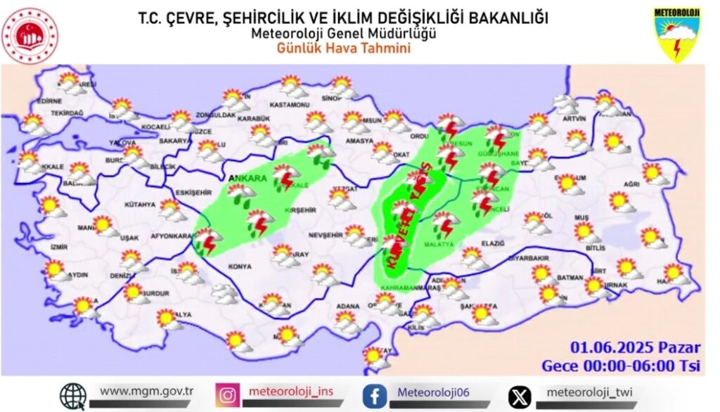 🗓️ 31 Mayıs 2025 Cumartesi günü itibarıyla yurdun batı ve iç kesimlerinde kuvvetli sağanak yağış ve şiddetli rüzgar bekleniyor. Özellikle İç Anadolu, Batı Karadeniz’in iç kesimleri, Ege’nin iç bölgeleri ile Kahramanmaraş, Kayseri ve Sivas çevrelerinde yağışların yer yer kuvvetli olacağı tahmin ediliyor. Marmara’da kuzeyli rüzgarların saatte 30-50 km hızla esmesi beklenirken, Doğu kesimlerde sıcaklık 3-5 derece artacak. 1 Haziran Pazar gecesi ise yağışların etkisi Doğu Anadolu ve Doğu Karadeniz bölgelerinde yoğunlaşacak. Vatandaşların sel, su baskını, yıldırım ve rüzgar kaynaklı olumsuzluklara karşı tedbirli olması uyarısında bulunuldu.