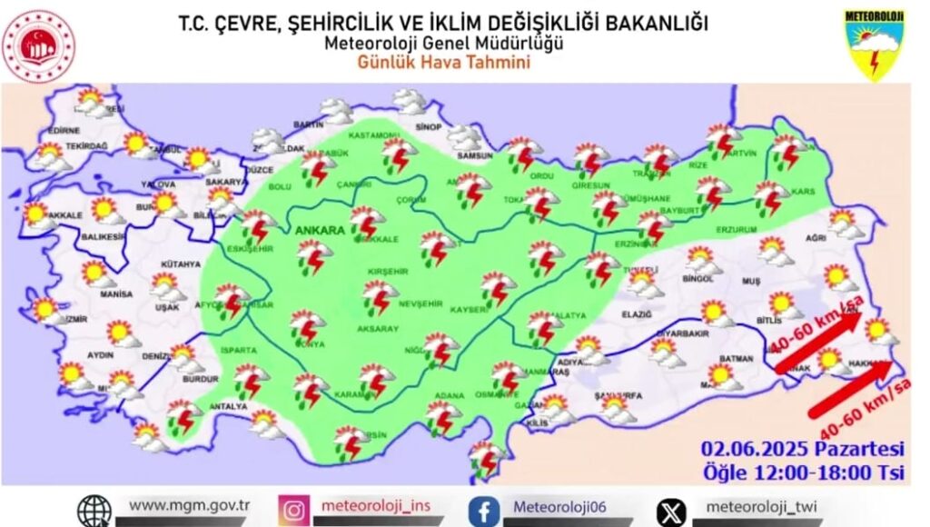 2-3 Haziran 2025 tarihlerinde Türkiye genelinde hava durumu batı bölgelerde güneşli ve mevsim normallerinde seyrederken, doğu ve iç kesimlerde sağanak yağışlar ile kuvvetli rüzgarlar etkili olacak. Meteoroloji Genel Müdürlüğü, özellikle Doğu Anadolu’nun kuzeydoğusu ile Doğu Karadeniz’de gök gürültülü sağanak uyarısında bulunurken; Van, Hakkâri ve Şırnak çevrelerinde saatte 60 km’ye ulaşan rüzgârlara karşı vatandaşları dikkatli olmaya çağırdı. Yağışlar 3 Haziran Salı günü de doğu bölgelerde etkisini sürdürecek.