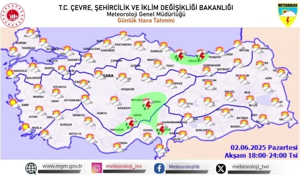Meteoroloji Genel Müdürlüğü, 2 Haziran Pazartesi günü için yayınladığı günlük hava tahmin raporunda, yurdun büyük bölümünde havanın açık ve az bulutlu olacağını bildirdi. Ancak doğu bölgelerde sağanak yağış ve kuvvetli rüzgar uyarısı yapıldı.