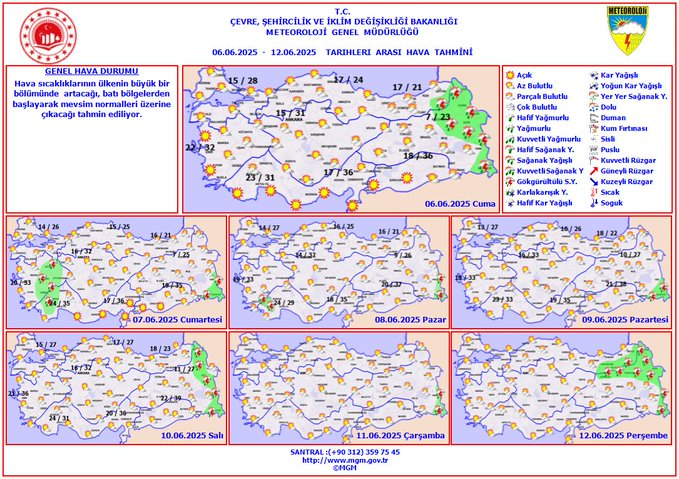 Meteoroloji Genel Müdürlüğü’nün son verilerine göre, 6-12 Haziran 2025 tarihleri arasında ülkemizin büyük bir bölümünde hava sıcaklıkları artacak, özellikle batı bölgelerden başlayarak mevsim normallerinin üstüne çıkacak. Bu hafta boyunca sıcak hava dalgası tüm yurda yayılırken, Doğu Karadeniz ve Doğu Anadolu’da aralıklı sağanak yağışlar etkili olacak.