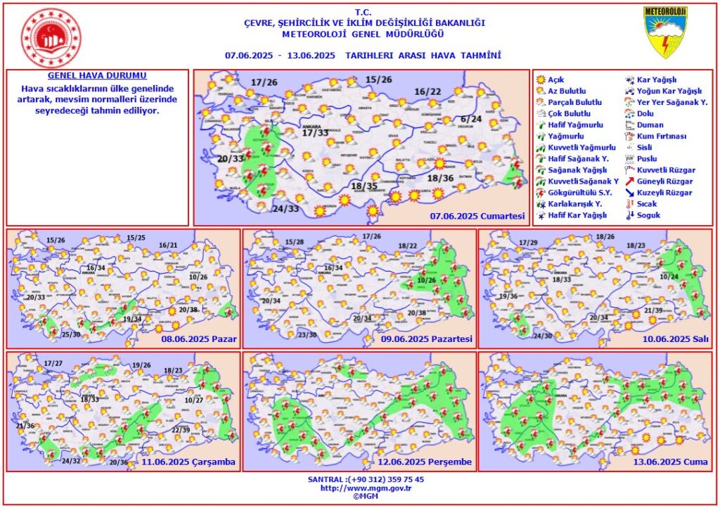Meteoroloji Genel Müdürlüğü’nün 7-13 Haziran 2025 tarihlerini kapsayan haftalık hava tahmin raporuna göre, Türkiye genelinde hava sıcaklıkları artarak mevsim normallerinin üzerine çıkacak. Özellikle batı ve güney bölgelerde sıcaklıkların yaz aylarını aratmayacak seviyelere ulaşması bekleniyor. Ancak hafta başında doğu bölgelerde yerel gök gürültülü sağanak yağışlar etkili olacak.