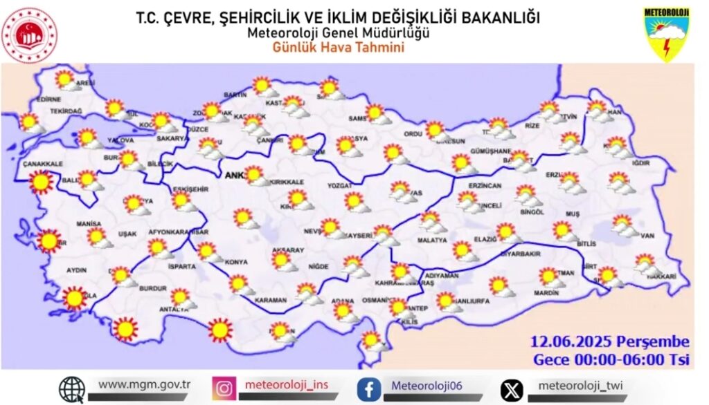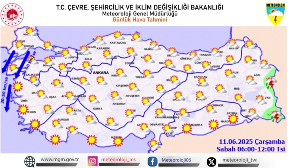 Meteoroloji Genel Müdürlüğü, 11 Haziran 2025 Çarşamba günü için Türkiye genelini ilgilendiren önemli bir hava durumu uyarısı yayımladı. Özellikle Marmara’nın güneybatısı, Ege kıyıları, Doğu Anadolu ve Güneydoğu Anadolu’nun bazı bölgelerinde kuvvetli rüzgar ve yerel gök gürültülü sağanak yağışların etkili olması bekleniyor.
