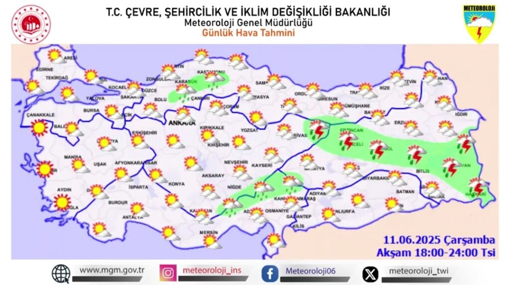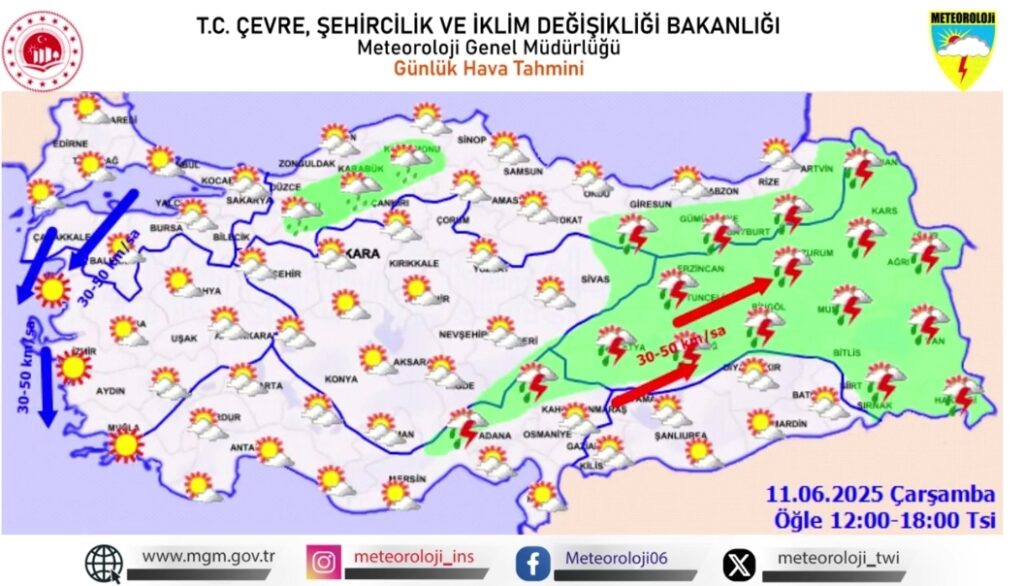 🔎 SEO Etiketleri: 11 Haziran 2025 hava durumu, Meteoroloji uyarısı, kuvvetli rüzgar uyarısı, gök gürültülü sağanak, Türkiye hava tahmini, Doğu Anadolu sağanak yağış, Ege kuvvetli rüzgar, haziran hava durumu