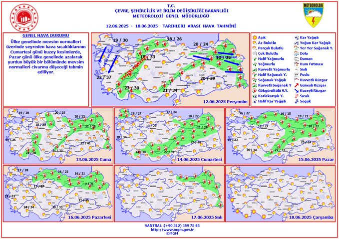 Meteoroloji Genel Müdürlüğü, 12-18 Haziran 2025 tarihleri arasındaki haftalık hava tahmin raporunu yayımladı.