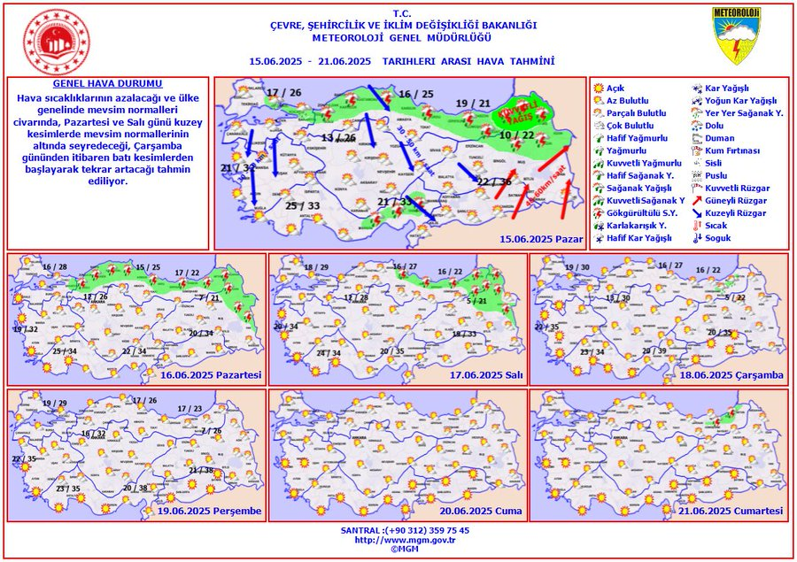 Türkiye, 15-21 Haziran 2025 tarihleri arasında mevsim normallerine yakın bir hava durumuyla karşı karşıya kalacak. Meteoroloji Genel Müdürlüğü (MGM) tarafından paylaşılan haftalık hava tahmini raporuna göre, sıcaklıklar Pazartesi ve Salı günleri kuzey kesimlerde mevsim normallerinin altında seyrederken, Çarşamba gününden itibaren batıdan başlayarak yeniden artış gösterecek. Hafta boyunca yağış beklenmezken, sıcaklıkların batıdan doğuya doğru hafifçe azalması dikkat çekiyor. İşte gün gün detaylı analiz: