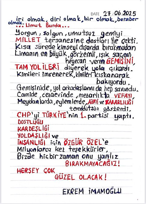 Tutuklu Cumhurbaşkanı adayı Ekrem İmamoğlu, cezaevinden gönderdiği el yazısı mesajında, CHP’ye ve Genel Başkan Özgür Özel’e yönelik planlı saldırılara karşı durduğunu belirterek, tüm partililere birlik ve beraberlik çağrısı yaptı. “Her şey çok güzel olacak” vurgusuyla yayımladığı mesajında, partinin başarıları ve dayanışma ruhunu öne çıkaran İmamoğlu, Özgür Özel’e desteğini yineleyerek, “Hiçbir zaman onu yalnız bırakmayacağız” ifadelerini kullandı.