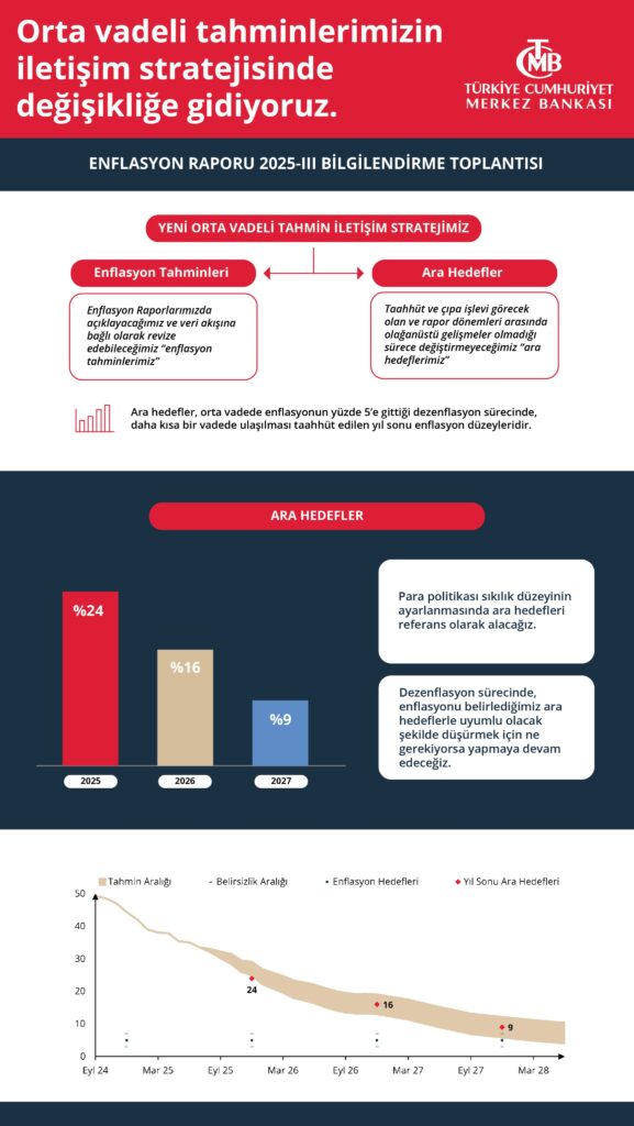 Türkiye Cumhuriyet Merkez Bankası (TCMB), Enflasyon Raporu 2025-III Bilgilendirme Toplantısı’nda orta vadeli tahmin iletişim stratejisini değiştirerek enflasyon hedeflerine “ara hedef” sistemi getirdi. Buna göre 2025 yıl sonu ara hedefi %24, 2026 hedefi %16 ve 2027 hedefi %9 olarak belirlendi. TCMB, para politikasının sıkılık düzeyini bu hedeflere göre ayarlayacağını, olağanüstü gelişmeler dışında hedeflerin değiştirilmeden uygulanacağını ve enflasyonu belirlenen seviyelere indirmek için tüm adımların atılacağını açıkladı.