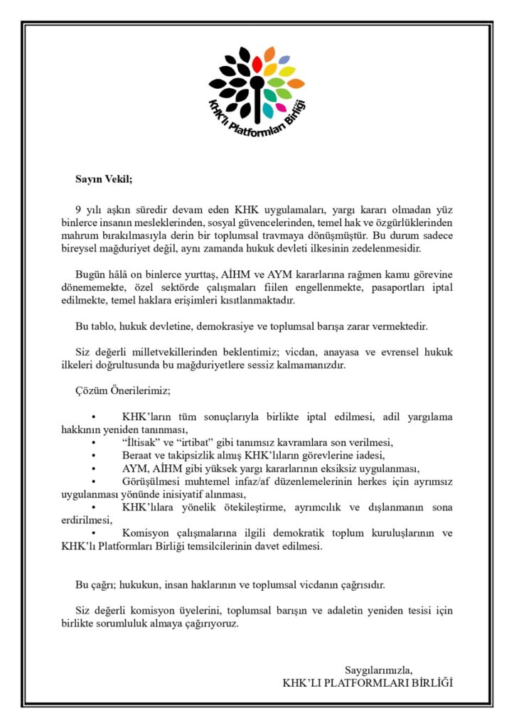 KHK’lı Platformları Birliği, milletvekillerine hitaben kaleme aldığı mektupta, yüz binlerce insanın mesleklerinden, sosyal haklarından ve temel özgürlüklerinden mahrum bırakılmasının derin bir toplumsal travmaya yol açtığını vurguladı. Platform, bu durumun yalnızca bireysel mağduriyet yaratmadığını, aynı zamanda hukuk devleti ilkesini ciddi şekilde zedelediğini belirtti. On binlerce yurttaşın Yargıtay, AİHM ve AYM kararlarına rağmen kamu görevine dönemediğine, özel sektörde çalışma ve seyahat özgürlüklerinin kısıtlandığına dikkat çekildi.