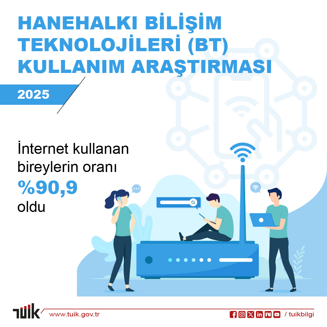 Türkiye İstatistik Kurumu (TÜİK) tarafından yayımlanan Hanehalkı Bilişim Teknolojileri (BT) Kullanım Araştırması, 2025 sonuçlarına göre, 16-74 yaş grubundaki bireylerin %90,9’u İnternet kullanıyor. Erkeklerde İnternet kullanım oranı %93,6, kadınlarda ise %88,2 olarak kaydedildi.