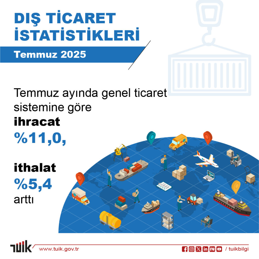 Türkiye İstatistik Kurumu (TÜİK) ve Ticaret Bakanlığı iş birliğiyle hazırlanan Dış Ticaret İstatistikleri, Temmuz 2025 bültenine göre, ihracat geçen yılın aynı ayına kıyasla %11,0 artarak 24 milyar 938 milyon dolara yükseldi. Aynı dönemde ithalat %5,4 artışla 31 milyar 383 milyon dolar olarak kaydedildi. Böylece dış ticaret açığı %11,8 azalarak 6,4 milyar dolara geriledi.