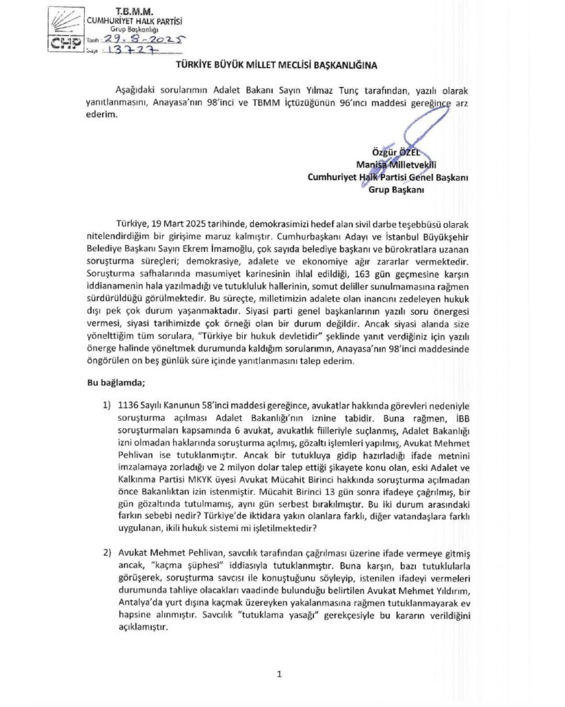 CHP Genel Başkanı Özgür Özel, TBMM’ye sunduğu soru önergesiyle Türkiye’de adalete güvenin ciddi şekilde zedelendiğini ve hukuk sisteminde ikili uygulamaların olup olmadığını Adalet Bakanı Yılmaz Tunç’a sordu.