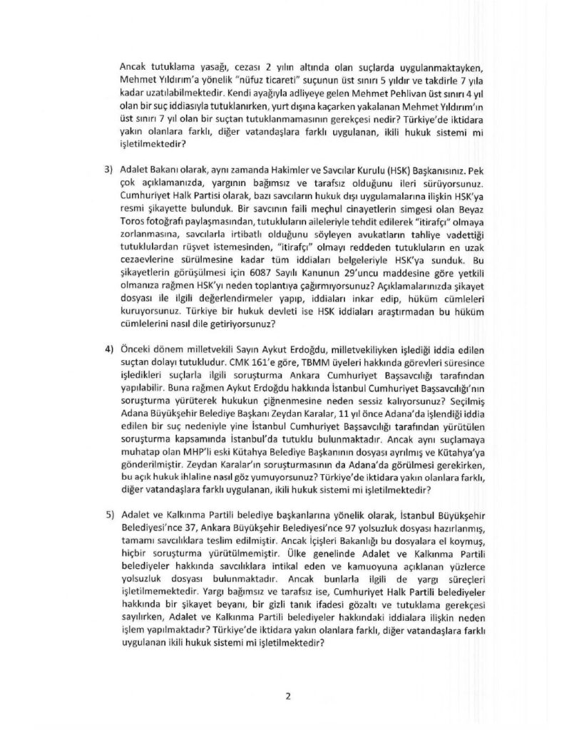 HSK ve Avukatların Tutuklanması: HSK Başkanı ve Adalet Bakanı’nın açıklamalarının taraflı olduğunun iddia edildiği önergede, Beyaz Toros fotoğrafı paylaşımı ve “itirafçı” söylemleriyle avukatların hedef gösterildiği, ancak sonrasında serbest bırakıldıkları belirtildi.