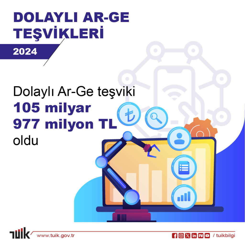 Türkiye İstatistik Kurumu’nun (TÜİK) yayımladığı “Dolaylı Ar-Ge Teşvikleri, 2024” verilerine göre, Ar-Ge destekleri 2023 yılına kıyasla önemli bir artış gösterdi. 2023’te 59 milyar 332 milyon TL olan toplam dolaylı Ar-Ge teşviki, 2024’te %78,6 artarak 105 milyar 977 milyon TL’ye ulaştı.