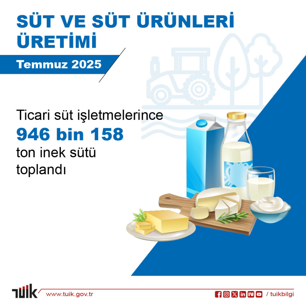 Ticari süt işletmelerince Temmuz 2025’te toplanan inek sütü miktarı geçen yılın aynı ayına göre %0,3 artarak 946 bin 158 tona ulaştı. İçme sütü üretimi %19,2 artışla 127 bin 164 ton olurken, yoğurt üretimi %4,4, ayran ve kefir üretimi %10 arttı. Ocak-Temmuz döneminde süt ve süt ürünlerinde genel artış eğilimi devam etti.