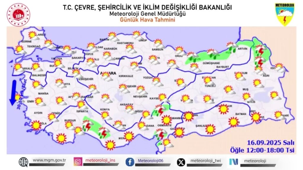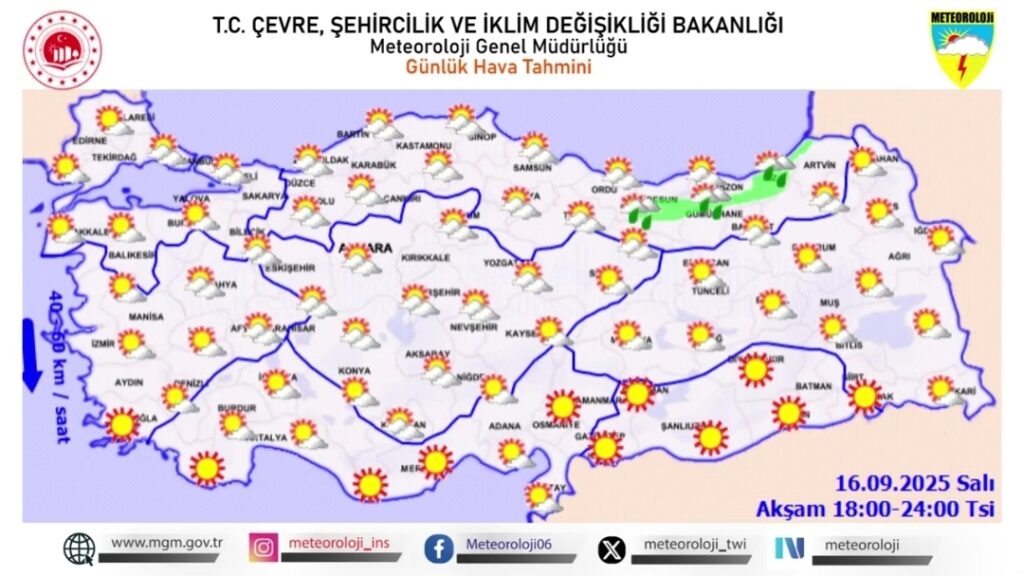 Meteoroloji Genel Müdürlüğü’nün son değerlendirmelerine göre, 16 Eylül 2025 Salı günü Türkiye genelinde hava parçalı ve az bulutlu olacak. Karadeniz’in iç kesimlerinde hava sıcaklıklarının 2 ila 4 derece azalması beklenirken, diğer bölgelerde önemli bir değişiklik öngörülmüyor.