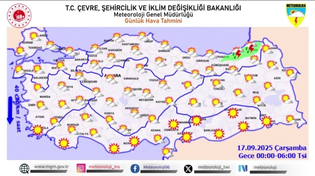 Sabah saatlerinde Türkiye genelinde parçalı ve az bulutlu bir hava hakim olacak. Ancak, Karadeniz Bölgesi’nin doğusunda (Rize ve Trabzon çevrelerinde) gök gürültülü sağanak yağışlar görülebilecek. Bu yağışların özellikle kısa süreli ve yerel kuvvetli olması bekleniyor.